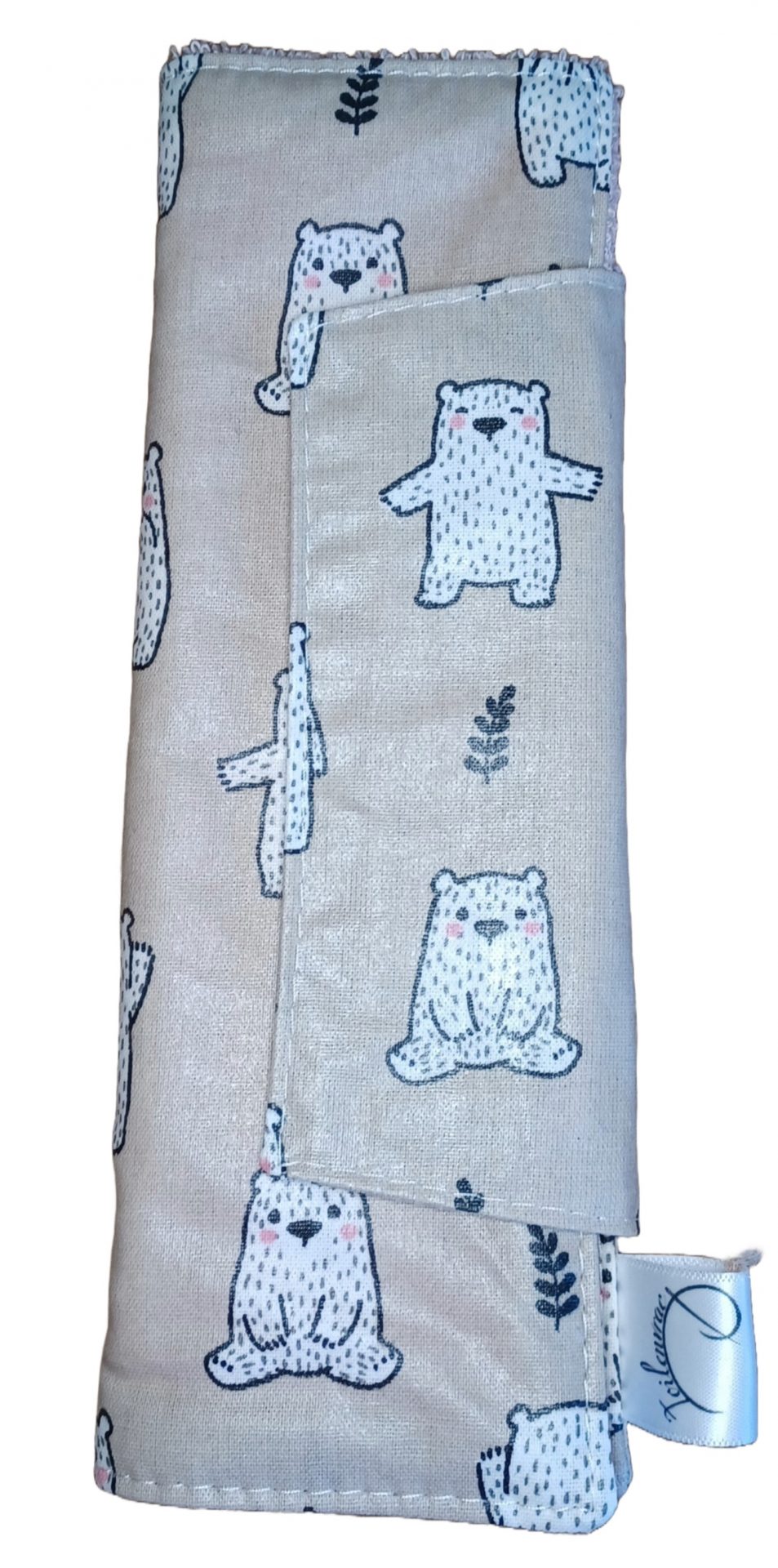 Ce porte brosse à dents enfant en tissu possède un emplacement pour brosse à dents manuelle et un emplacement pour dentifrice.