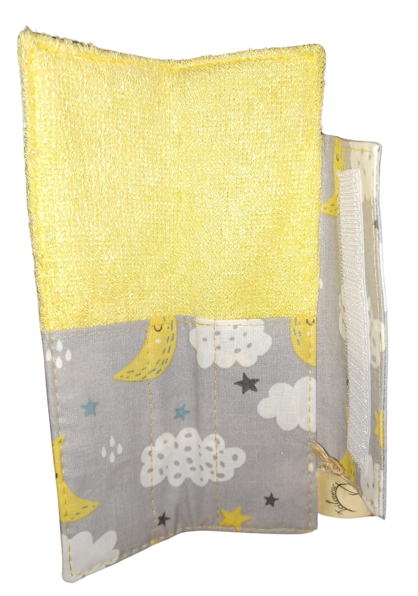 Ce porte brosse à dents enfant en tissu possède un emplacement pour brosse à dents manuelle et un emplacement pour dentifrice.